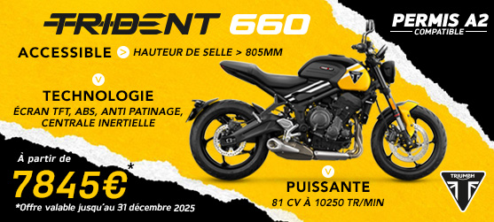*Pour tout achat d’une Triumph Trident 660 neuve (Hors Edition Tribute) commandée et livrée entre le 1er Octobre et 31 Décembre 2025.